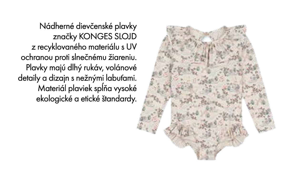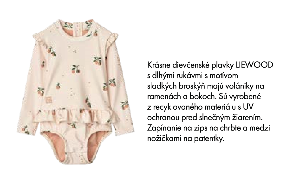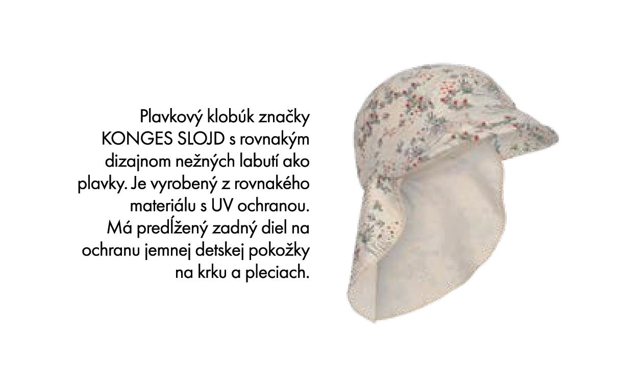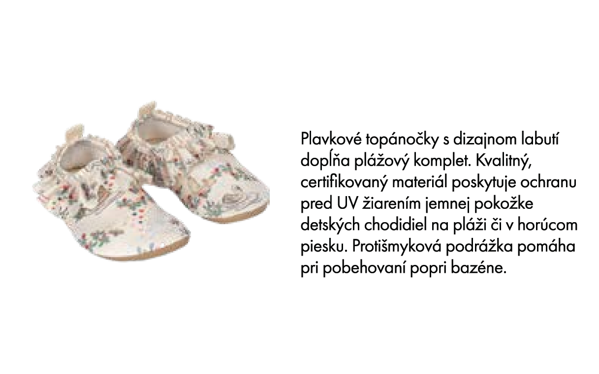Detská pokožka by v letných mesiacoch mala byť chránená aj vhodným oblečením. Obliekajte deťom ľahké, vzdušné, prírodné materiály ako bavlna, bambus, viskóza alebo merino s nižšou gramážou. Voľte svetlejšie farby oblečenia a nezabúdajte na pokrývku hlavy. Aj pri kúpaní viete poskytnúť svojim deťom maximálnu ochranu pokožky plavkami, ktoré zakrývajú čo najväčšiu plochu tela a sú šité z takého plavkového materiálu, ktorý vďaka špeciálnej technológii poskytuje ochranu UV50 pred slnečným žiarením. Sú to špeciálne plavky, ktoré však vďaka odolnému materiálu vydržia deťom viac rokov. Môžu to byť plavkové tričká s dlhým rukávom či plavkové overaly. Prekrytú pokožku pod takýmito plavkami nemusíte natierať. Hlavu chráňte napríklad plavkovým klobúkom z rovnakého materiálu, s predĺženým zadným dielom na prekrytie pokožky krku. Detské nôžky a priehlavky majú veľmi jemnú a tenkú pokožku, ktorá sa vie na slnku rýchlo spáliť. Preto odporúčame obúvať deťom k vode, na pláž či k bazénu špeciálne plavkové topánočky na to určené.