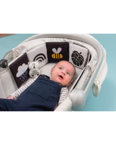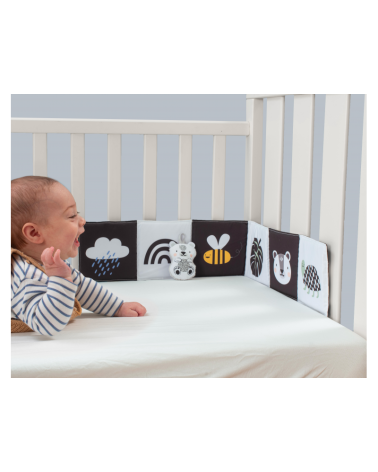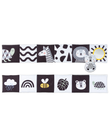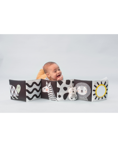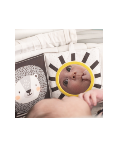 Kniha ponúka dve strany s bezpečným zrkadlom a vysoko kontrastnými obrázkami v základných farbách, ktoré podnecujú rozvoj zmyslov a emočnej inteligencie dieťaťa.