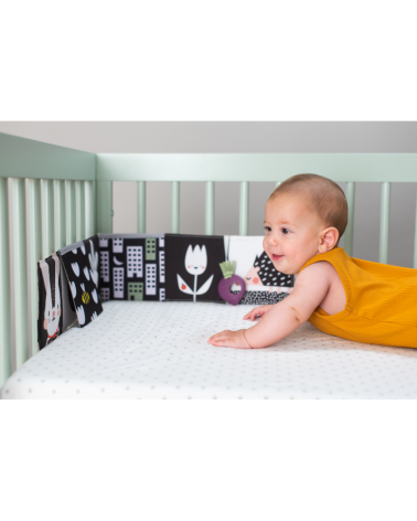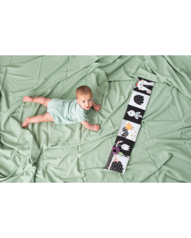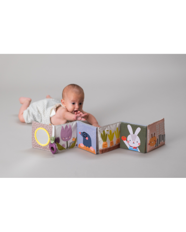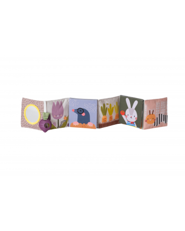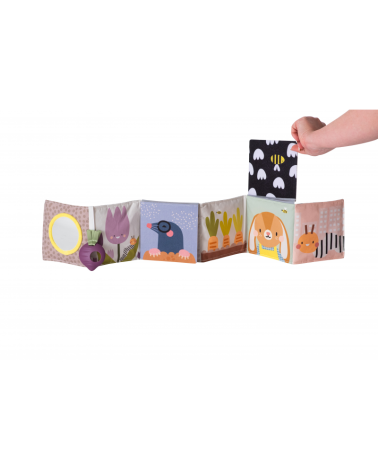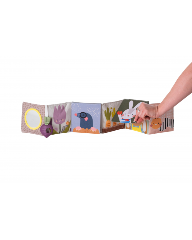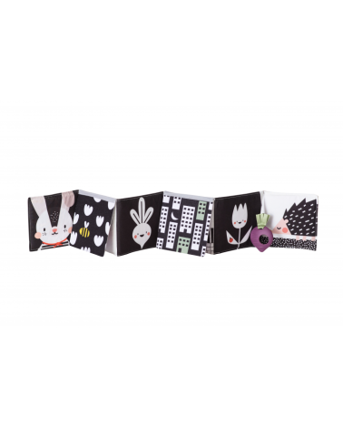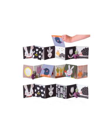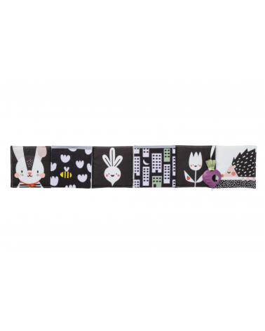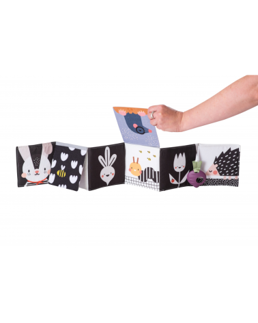 Knižka drží postavená samostatne pre hru na brušku alebo je možné ju pripevniť pomocou plastových klipov na postieľku či do kočíka.