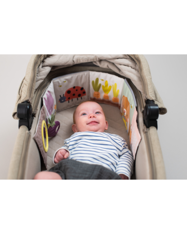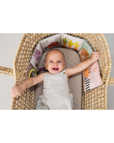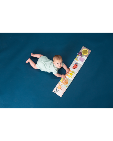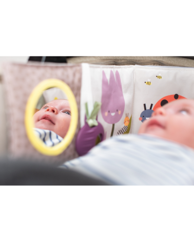 Od 3 mesiacov: strana farebnými obrázkami, bezpečným zrkadlom, hryzátkom a rôznorodými textúrami na skúmanie, ktoré podporujú rozvoj zmyslov a jemnej motoriky dieťaťa.