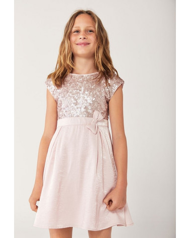 Dievčenské šaty kombinované s flitrovým tylom v ružovej farbe. Zapínajú sa pomocou neviditeľného zipsu na zadnej strane. Živôtik je vyrobený z tylu s flitrami v dvoch veľkostiach a krk a rukávy majú krepový lem v ružovej farbe. V páse majú všitú krepovú mašľu. Body a sukňa sú podšité.