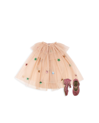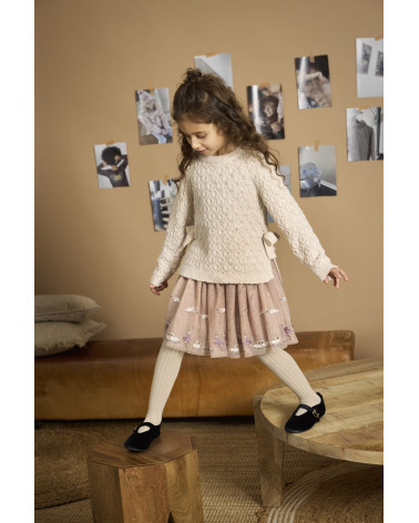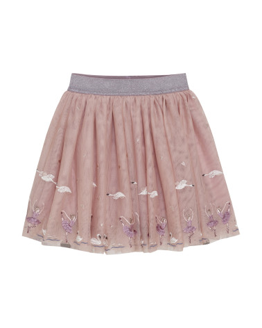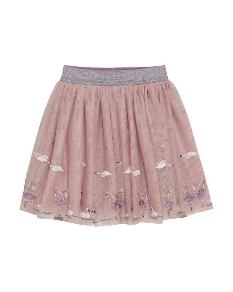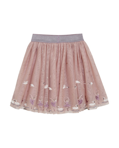 Elegantná sukňa od značky Minymo. Sukňa má krásnu tylovú vrstvu zdobenú vyšívanými labuťami a baletkami. V páse má trblietavú gumičku, vďaka ktorej sa pohodlne nosí. Sukňa je ideálna na každodenné nosenie aj na formálnejšie príležitosti.